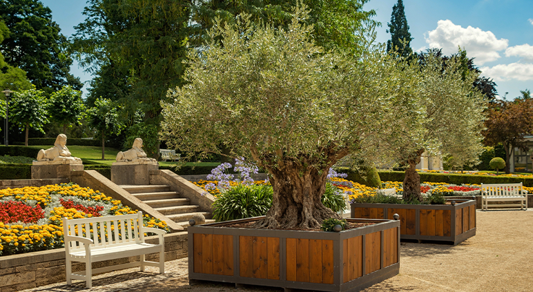 Ce jardin méditerranéen, agrémenté de plantes telles que des oliviers et de la lavande, crée une atmosphère chaleureuse et naturelle. Il est parfait pour un mariage intime ou un cocktail en plein air, offrant un cadre paisible et élégant.